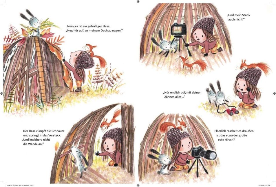 Alles läuft perfekt, bis ein Eichhörnchen auf Emmas Kamera springt und für ordentliches Durcheinander in Emmas Fotorevier sorgt. Doch damit nicht genug! Ein Hase knabbert Emmas Versteck an, ein Biber klaut ihr Äste, ein Dachs stibitzt ihr Tarnnetz, eine ganze Tierschaar macht es Emma einfach unmöglich, sich auf ihr Fotoprojekt zu konzentrieren.
