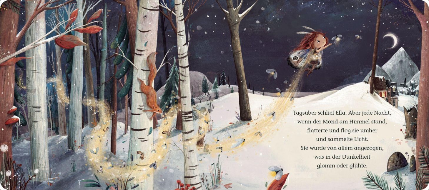 Die Licht liebende Ella macht das Beste aus ihrer Situation. Des nachts fliegt sie umher, um all das Licht der Sterne einzusammeln und denjenigen zu bringen, die ein Licht im Winterdunkeln brauchen. Auf diese Weise lernt Ella den Fuchs Zobel und die Eule Luna kennen, die zu ihren guten Freunden werden.