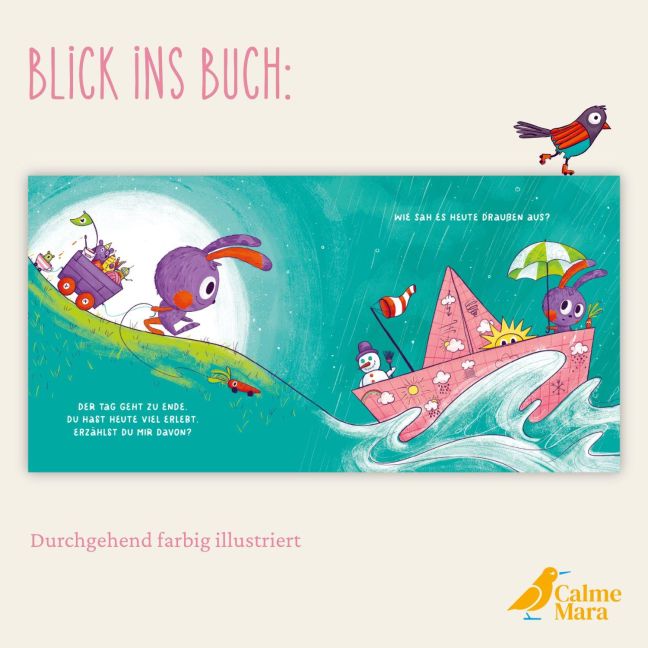 Darüber hinaus ist dieses Pappbilderbuch sehr hilfreich dabei, all die im Kopf kreisenden Gedanken am Abend loszulassen, diese in geborgenem Umfeld dem Lieblingsmenschen anzuvertrauen und dadurch besser in den Schlaf zu finden.