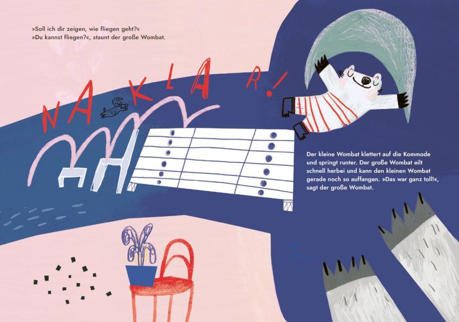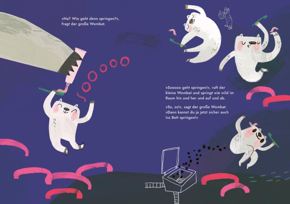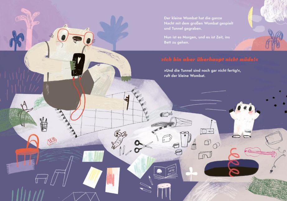 - Der kleine Wombat fühlt nicht, wie müde er ist. So viel will er noch tun: einen Tunnel graben bspw. und Papa all das zeigen, was er schon kann. Bis der kleine Wombat irgendwann die Müdigkeit spürt und *Spoileralarm Papa zeigen kann, wie das Einschlafen geht. Kindern hilft das Bilderbuch deshalb gut dabei, selbst zu spüren, wie sich der eigene Körper gerade anfühlt und was er gerade braucht.